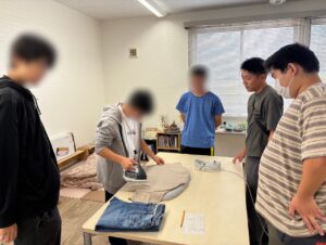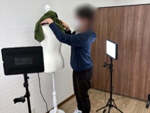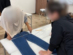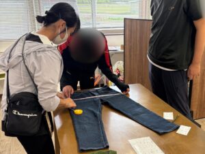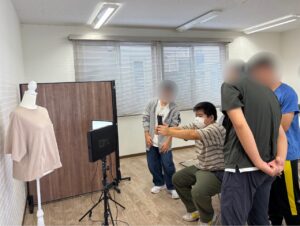利用者さん2人(なんと高校の卒業生!)に普段の仕事内容を紹介していただいたあと、販売される洋服の採寸と写真撮影のお仕事を体験!